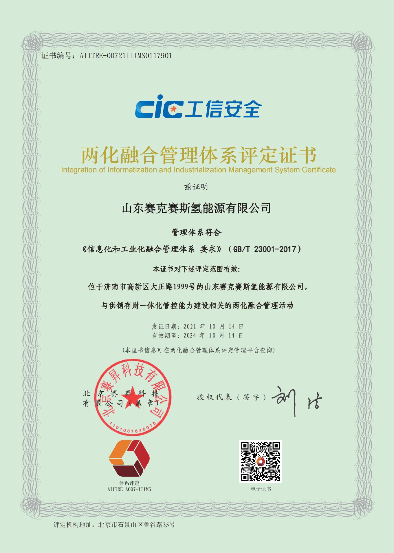 兩化融合管理體系評(píng)定證書(shū)